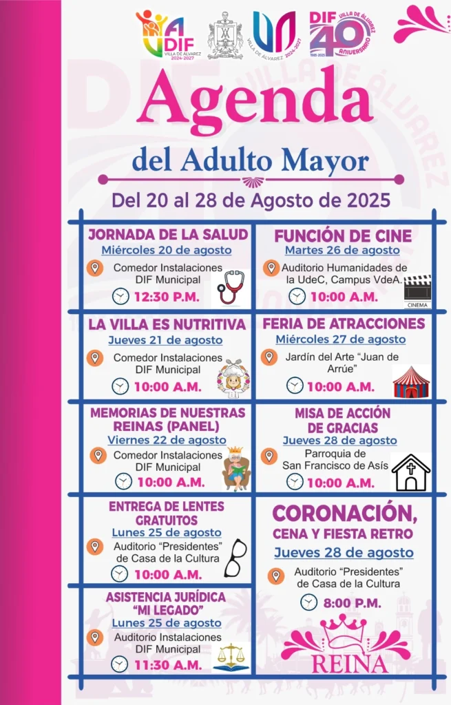 El jueves 28 de agosto se realizará la misa de Acción de Gracias en la Parroquia de San Francisco de Asís. Cerrando las actividades ese mismo día con la Coronación de la Reina del Adulto Mayor de Villa de Álvarez 2025 que se llevará a cabo en el Salón Presidentes de la Casa de la Cultura.