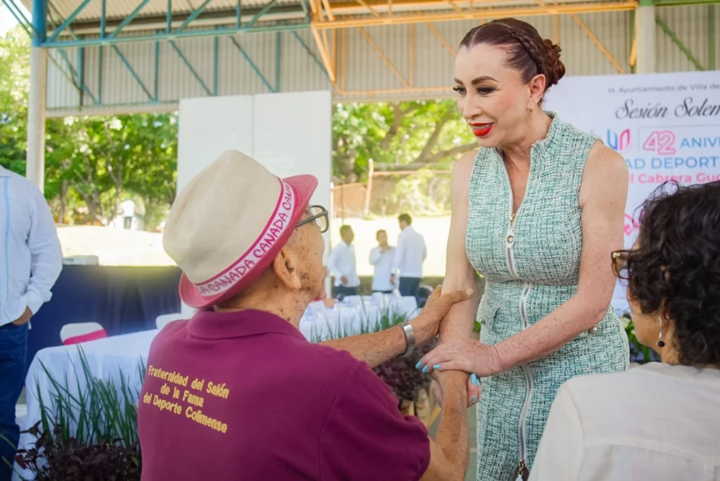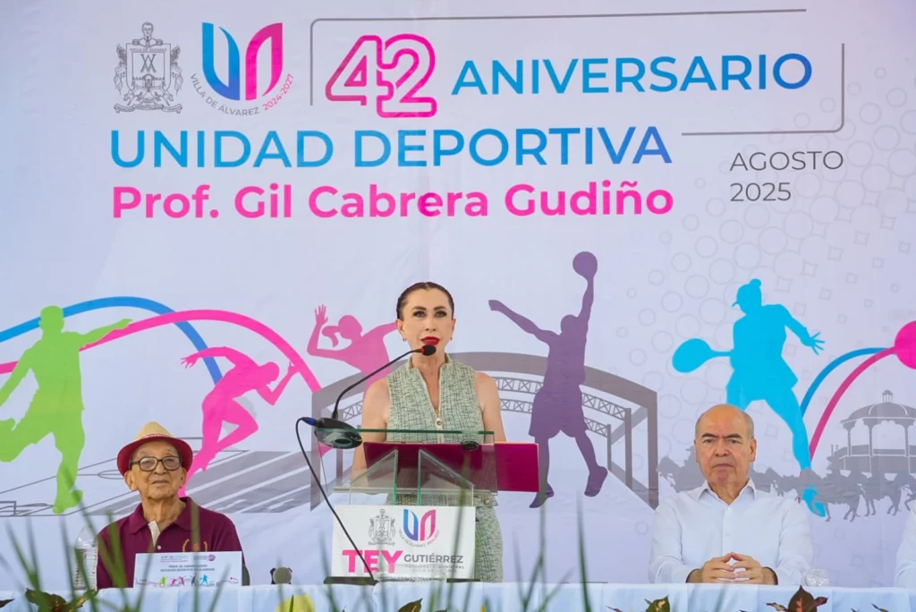 Villa de Álvarez, Col.- En el 42 aniversario de la Unidad Deportiva “Profr. Gil Cabrera Gudiño”, la Presidenta Tey Gutiérrez Andrade destacó que ese lugar es vital en el desarrollo de Villa de Álvarez, tanto para disminuir la violencia y las adicciones, como combatir las enfermedades crónico degenerativas e impulsar el desarrollo de talentos deportivos.
