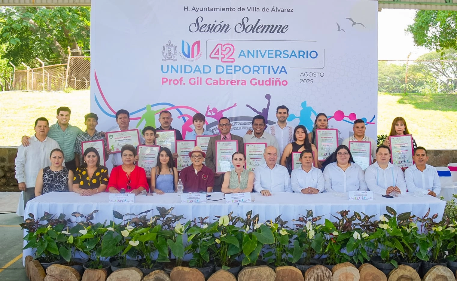 En el marco del 42 aniversario de la Unidad Deportiva “Profr. Gil Cabrera Gudiño”, Tey Gutiérrez, el Síndico y Regidores y Regidoras, entregaron reconocimientos a Diego Alejandro Morales Velásquez, por su destacada participación en Beach Handball, a Rebeca Aveitia Hernández, del Grupo de Bastoneras y Pomponeras, y a Jorge Ávalos Cardenas, por la promoción del deporte organizado en las colonias de Villa de Álvarez.