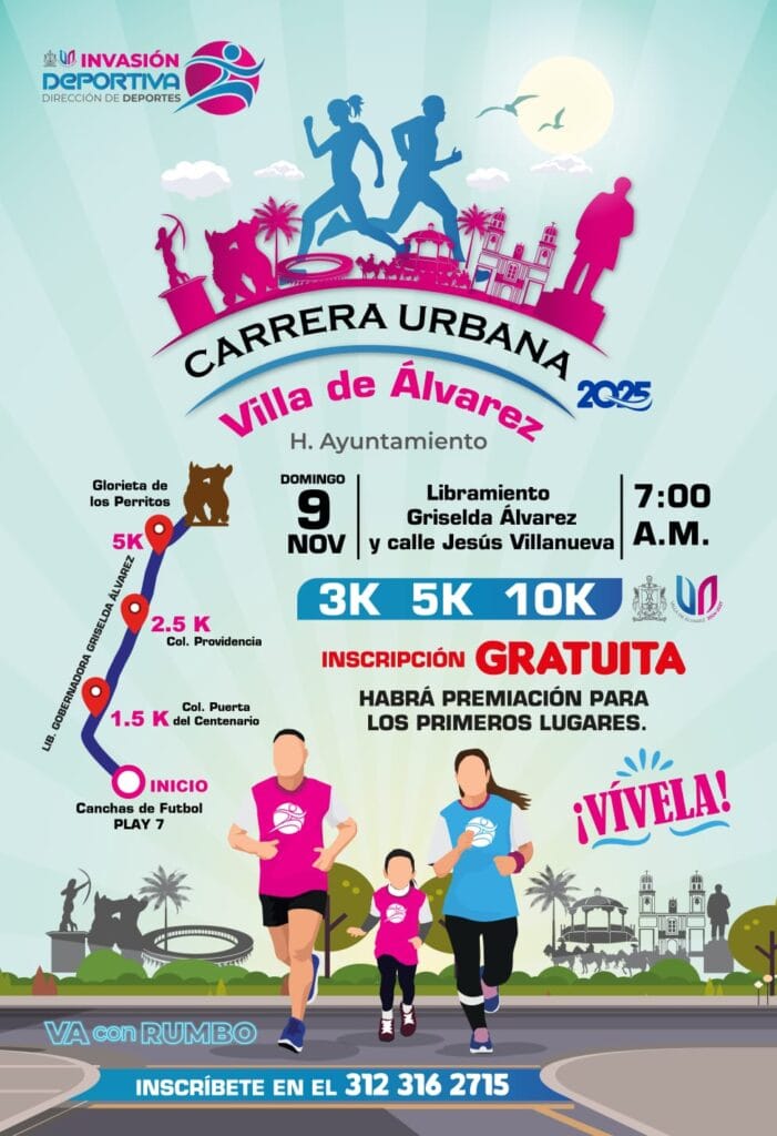 Sergio Dolores Villalvazo, Director de Deportes de Villa de Álvarez, indicó que la Carrera Urbana Villa de Álvarez 2025, la cual forma parte del programa Invasión Deportiva, iniciará a las 7:00 de la mañana en las cancha de Play 7, concluyendo en ese mismo lugar, luego de llegar a la Glorieta de Los Perritos.