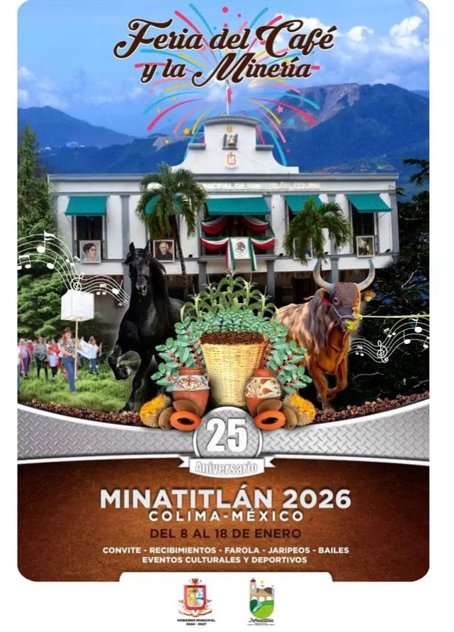 El municipio de Minatitlán presentó oficialmente el cartel de la Feria del Café y la Minería 2026, una de las celebraciones más representativas de la región, que este año conmemorará su 25 aniversario. El evento se llevará a cabo del 8 al 18 de enero de 2026, reuniendo tradiciones, cultura y actividades que enaltecen la identidad del municipio