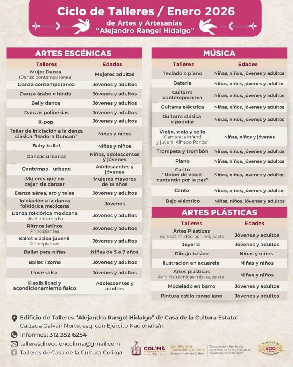 La Subsecretaría de Cultura invita al público en general a conocer y participar en la oferta de talleres de la Casa de la Cultura Estatal correspondientes al ciclo enero–agosto 2026-2, un programa diseñado para fomentar la creatividad, el aprendizaje artístico y el desarrollo cultural de la comunidad.