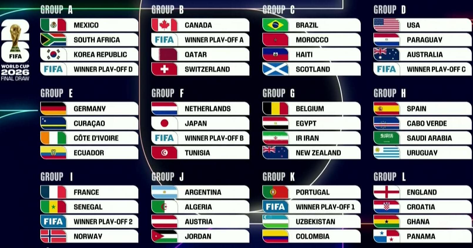 El sorteo también colocó a Francia en el Grupo I con Senegal, Noruega y un ganador del repechaje (Iraq, Bolivia o Surinam), mientras que Portugal liderará el Grupo K, acompañado de Uzbekistán, Colombia y un representante adicional proveniente de repechaje.