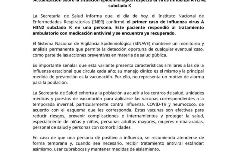 Salud federal confirma el primer caso en México de la variante de influenza A H3N2 “subclado K”, conocida como “super gripe”